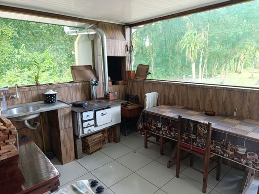 Cozinha com churrasqueira e fogão a lenha